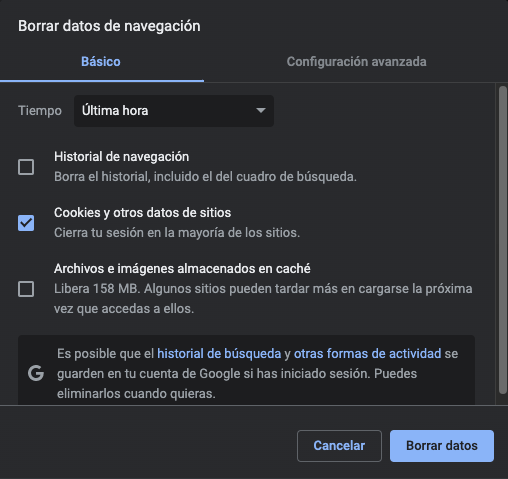 Por último, en la ventana emergente, selecciona el intervalo de tiempo en el que quieres eliminar las cookies y marca la casilla «Cookies y otros datos de sitios».