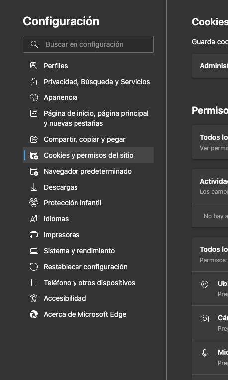 En esta nueva ventana, haz clic en «Cookies y permisos del sitio» en el sidebar de la izquierda: