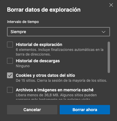 Por último, selecciona el intervalo de tiempo en el que quieres borrar las cookies y no te olvides de marcar la casilla de «Cookies y otros datos del sitio».